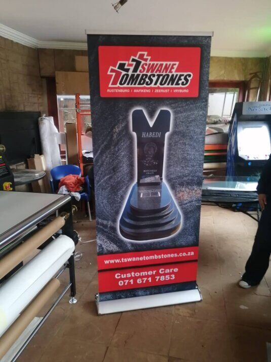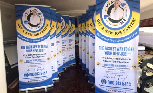 Professional pull-up banner stand with high-resolution printed graphic display, designed for exhibitions, retail promotions, conferences, and marketing events. Lightweight aluminium base with retractable roll-up mechanism for easy setup and portability.850 x 2000mm Single sided R1250