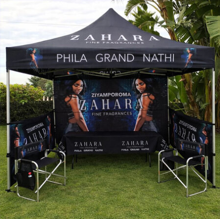3x3m Premium alu gazebo, two popup banners and two stunning branded director's chairs, a 1.4 x 3.0m table and two 3.2m (any shape) flying banners